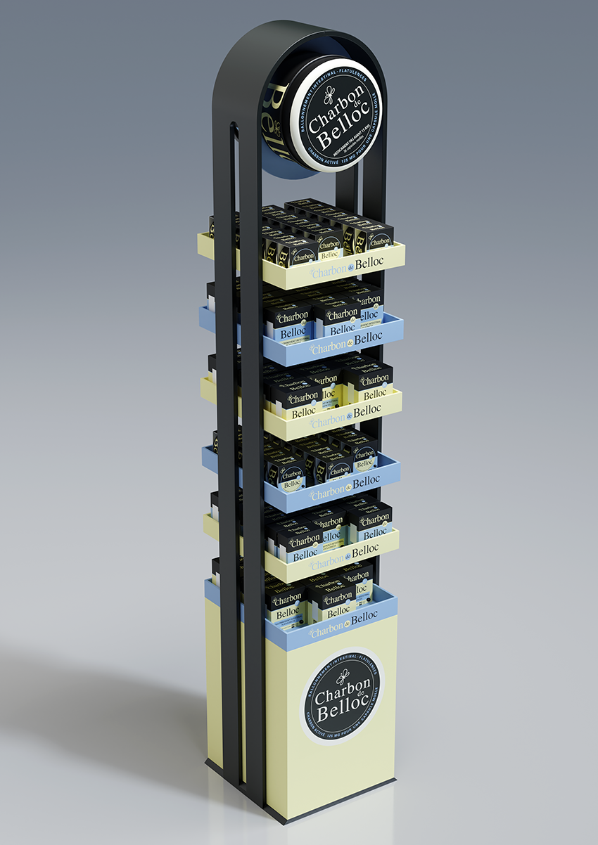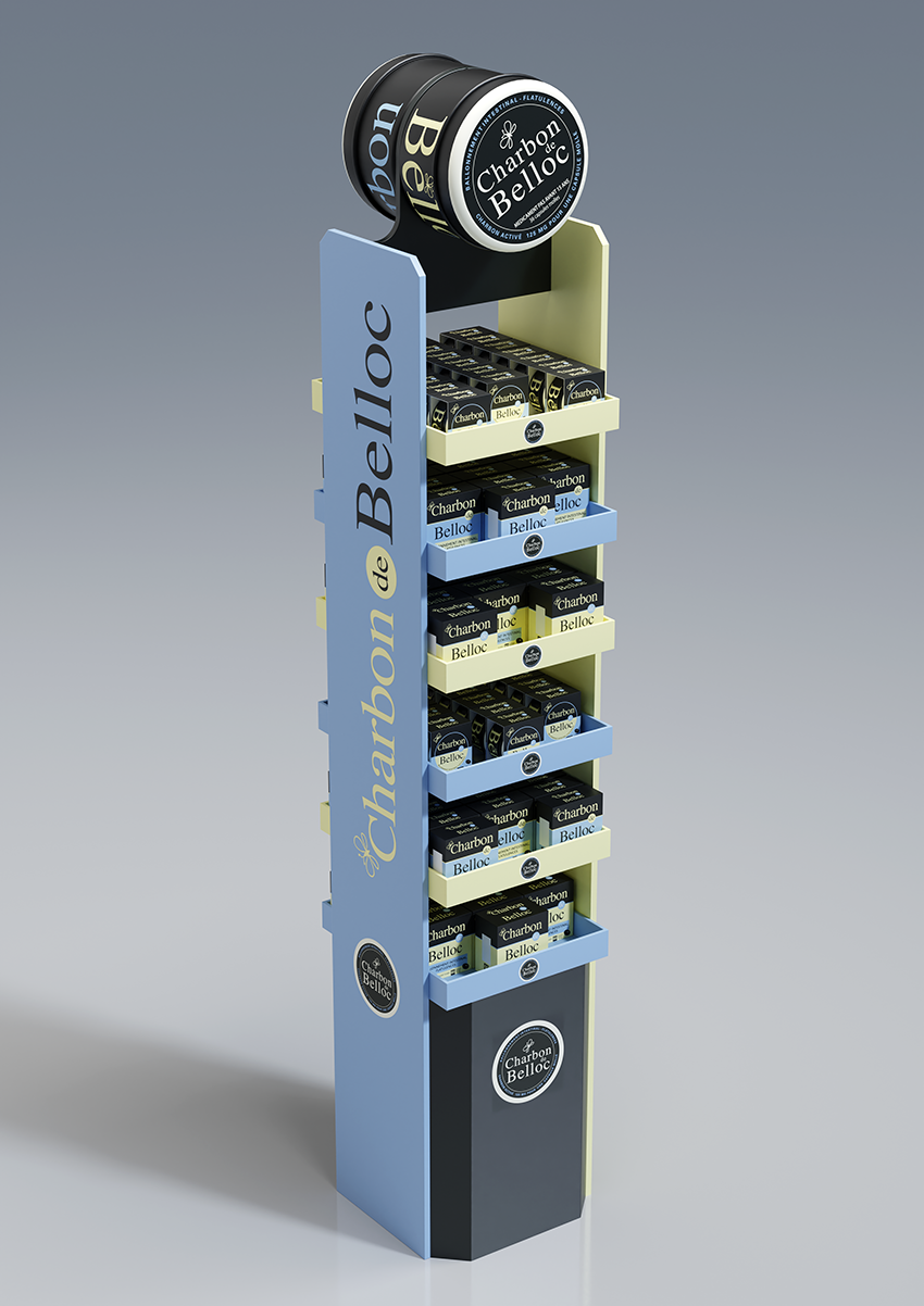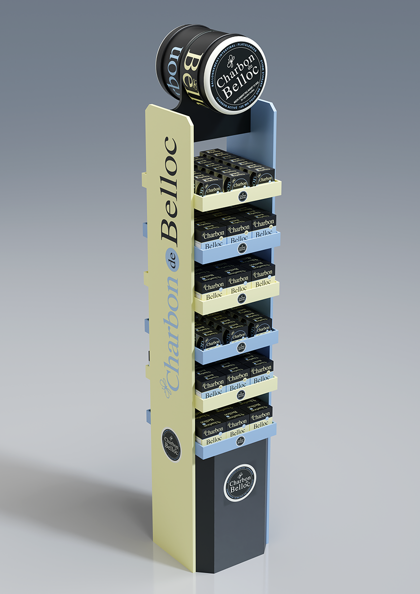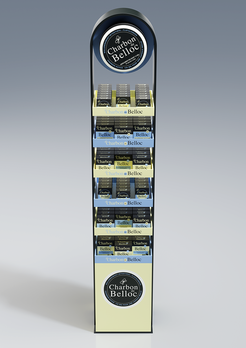 Conception d'une PLV de sol pharmacie double face avec un plan de charge sur six niveaux.