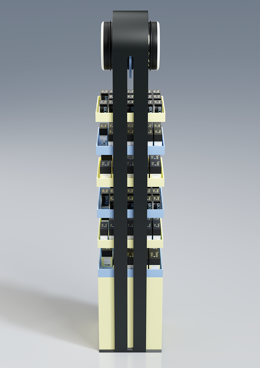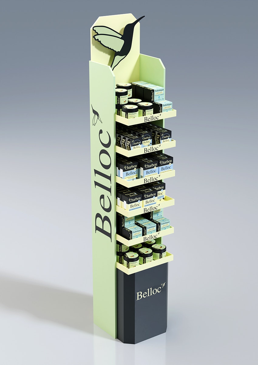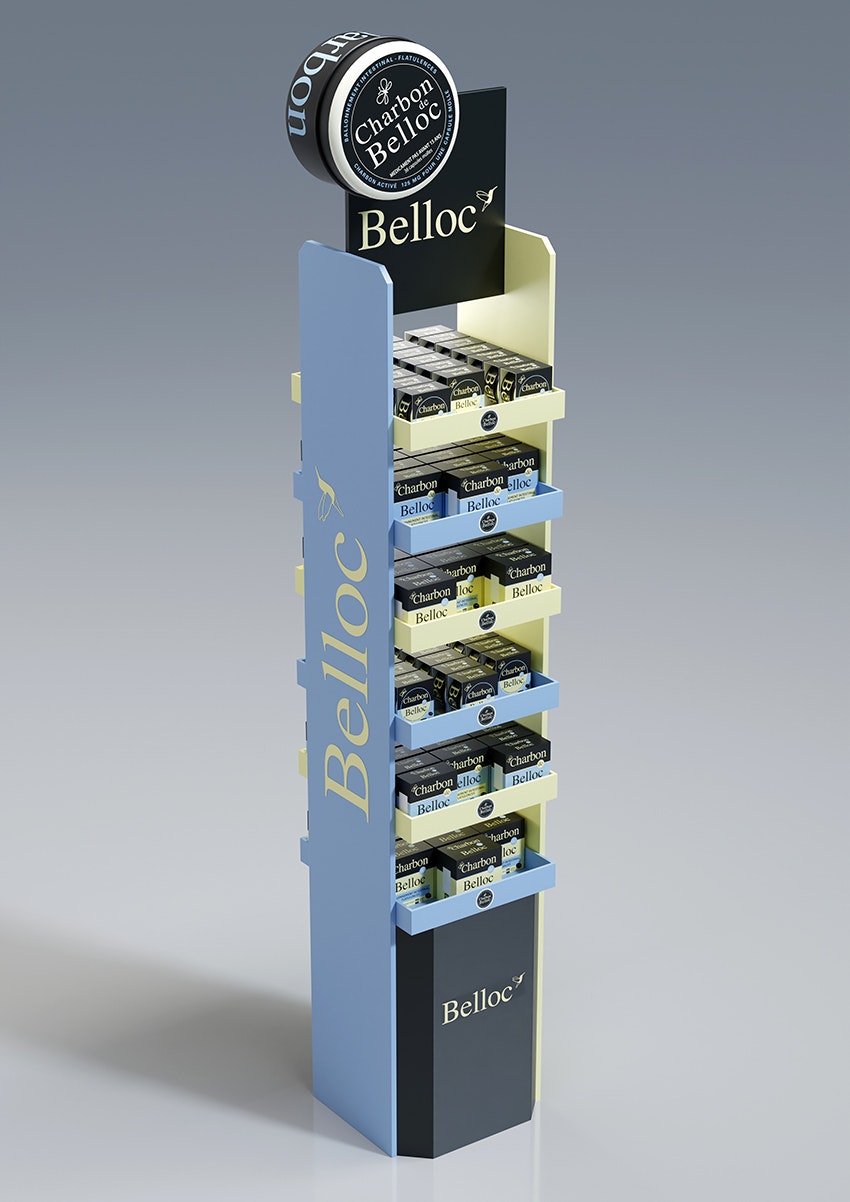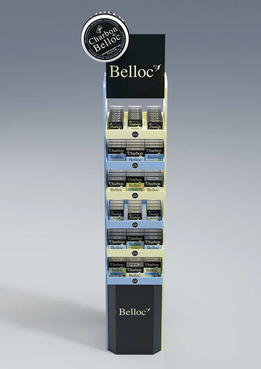 Conception d'une PLV de sol pharmacie double face avec un plan de charge sur six niveaux.