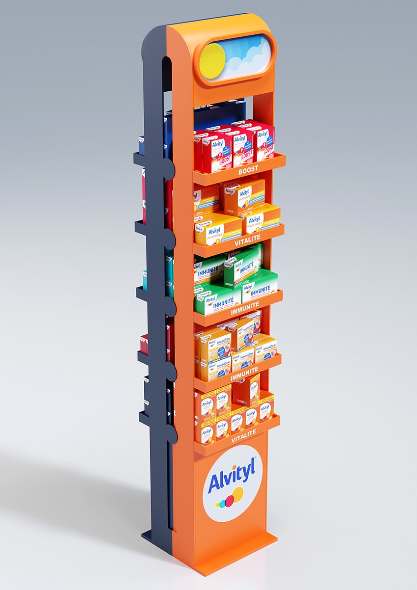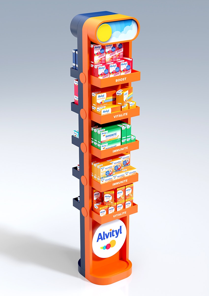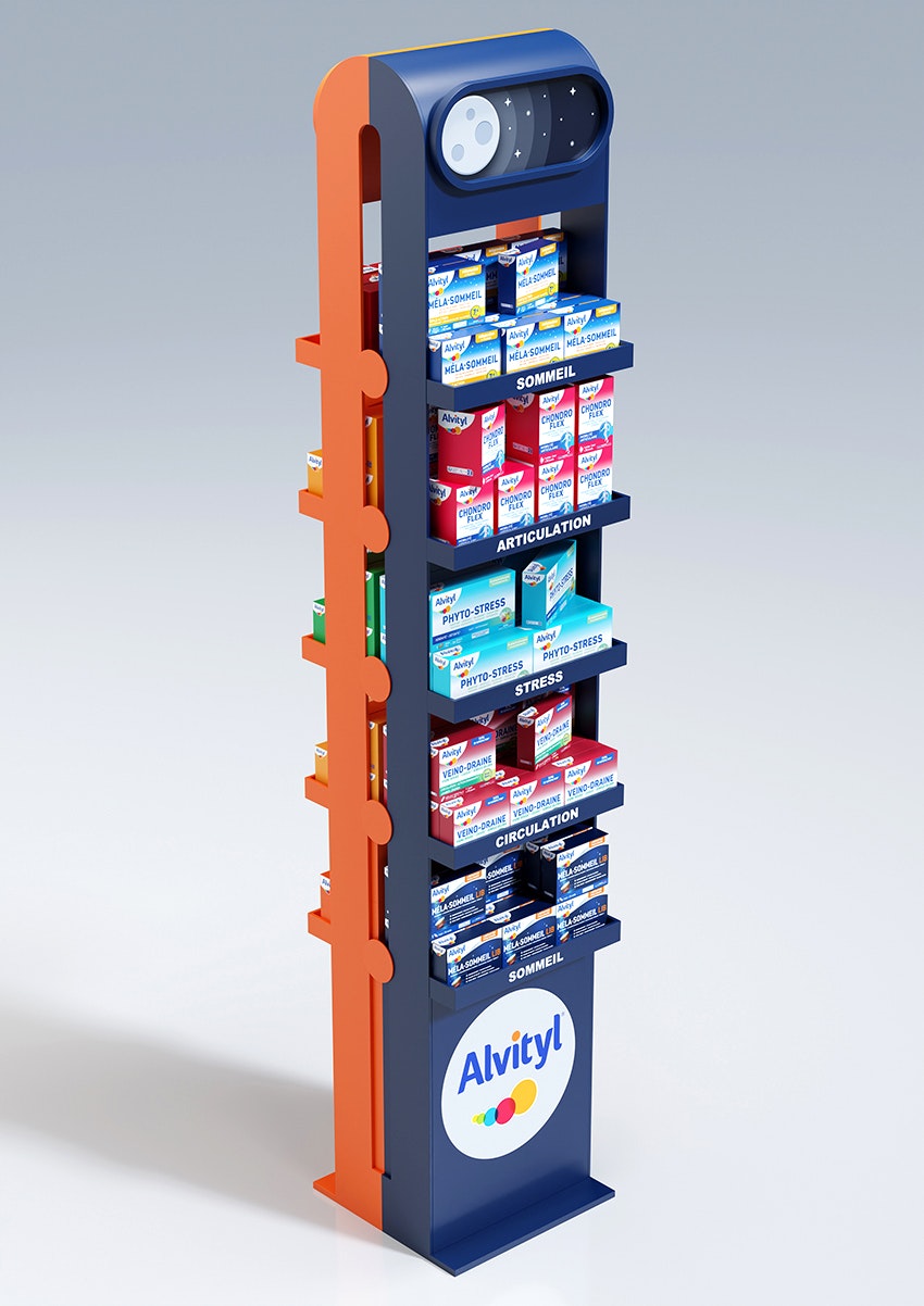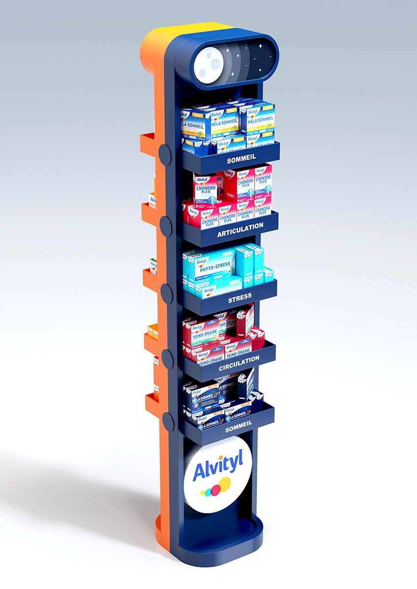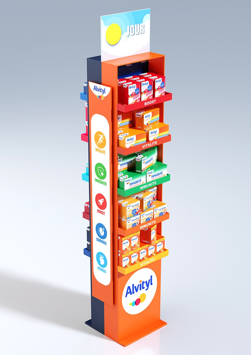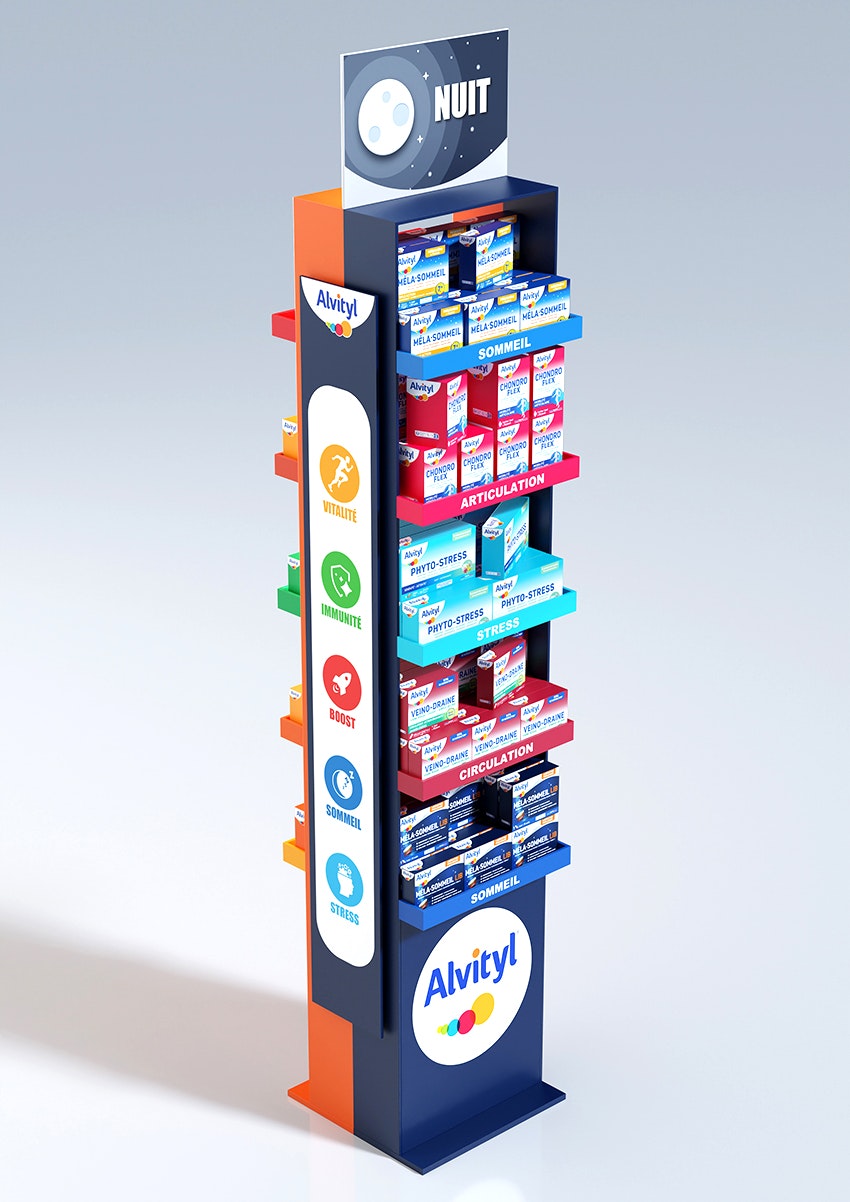 Conception d'une PLV de sol pharmacie clairement différenciée entre les gammes jour et nuit en double face. Plan de charge sur 5 niveaux avec 10 produits, en 3 axes créas.