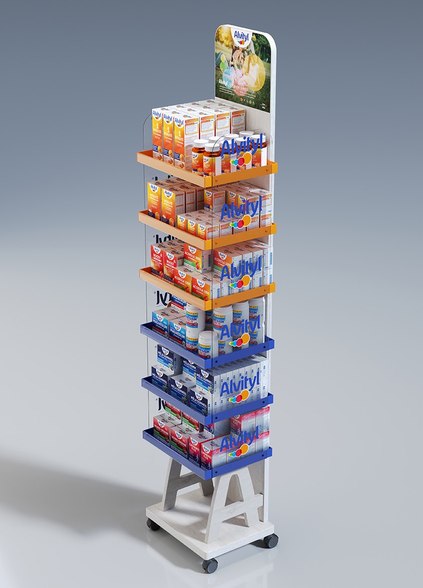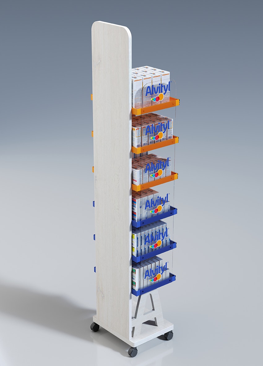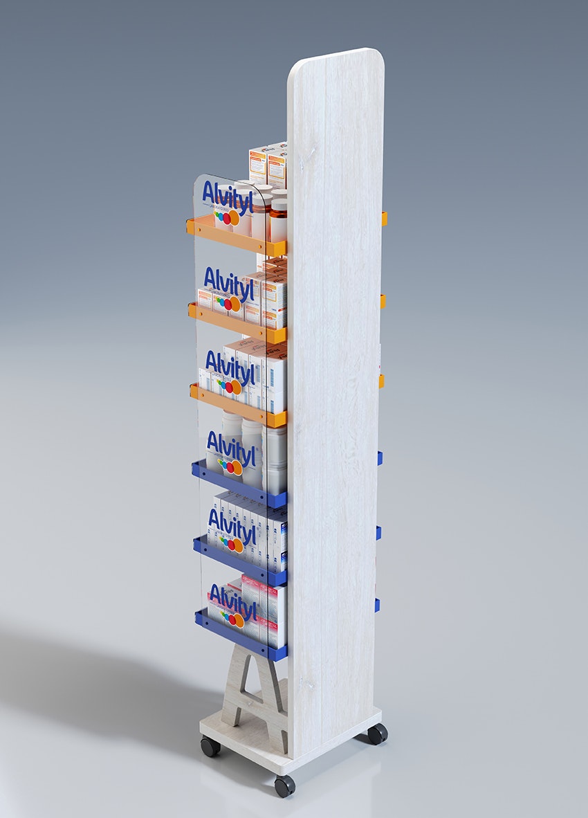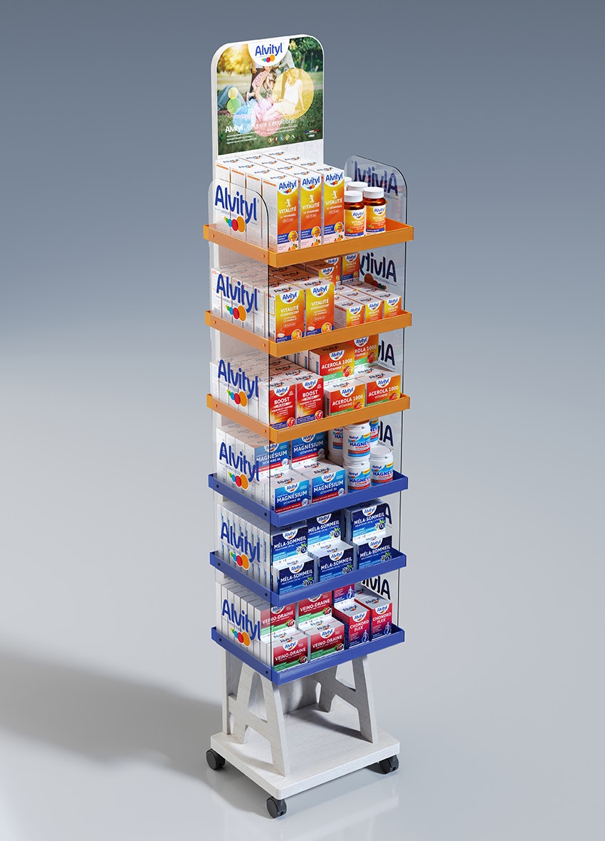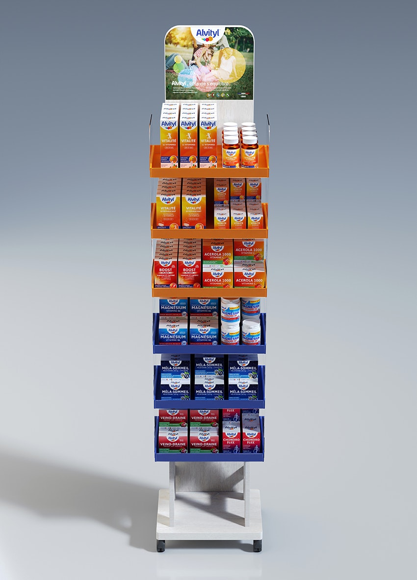 Conception d'une PLV de sol pharmacie permanente haut de gamme. Plan de charge sur 6 niveaux 1 face.