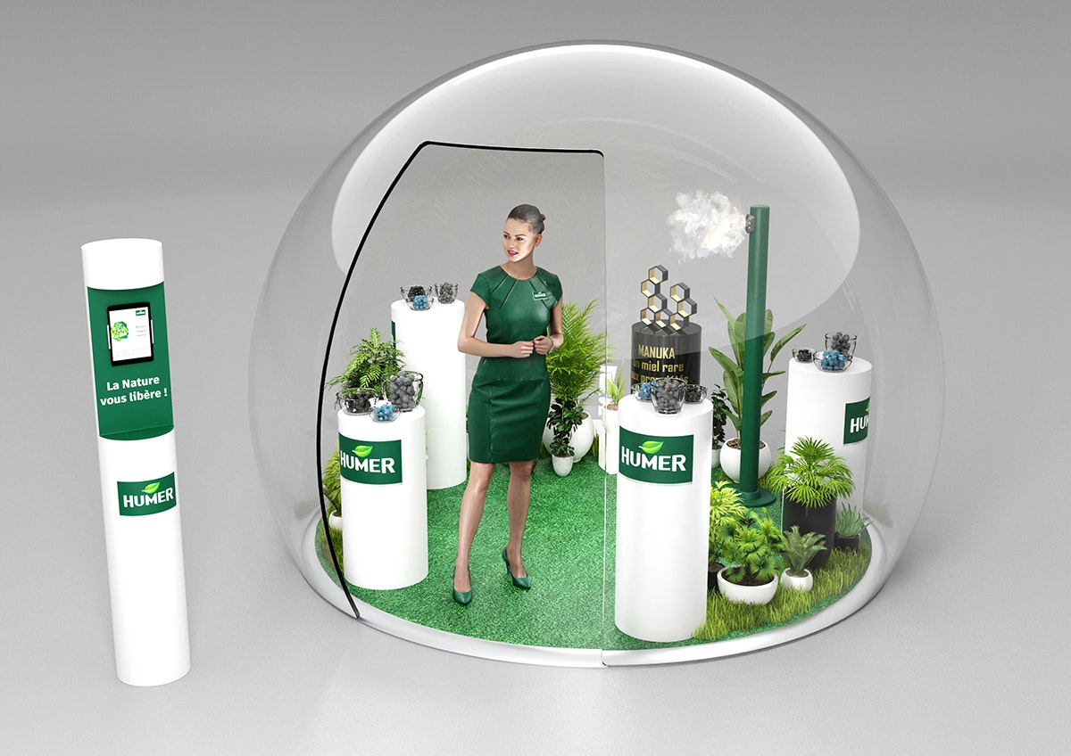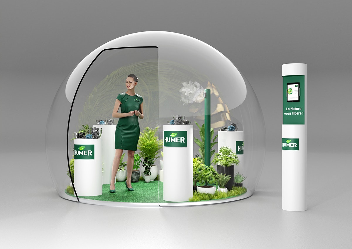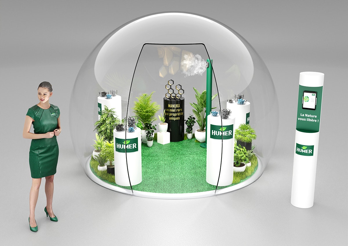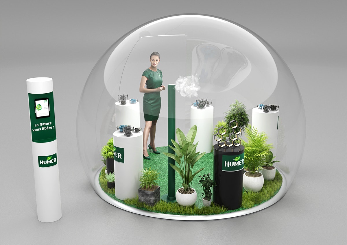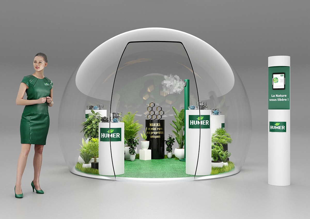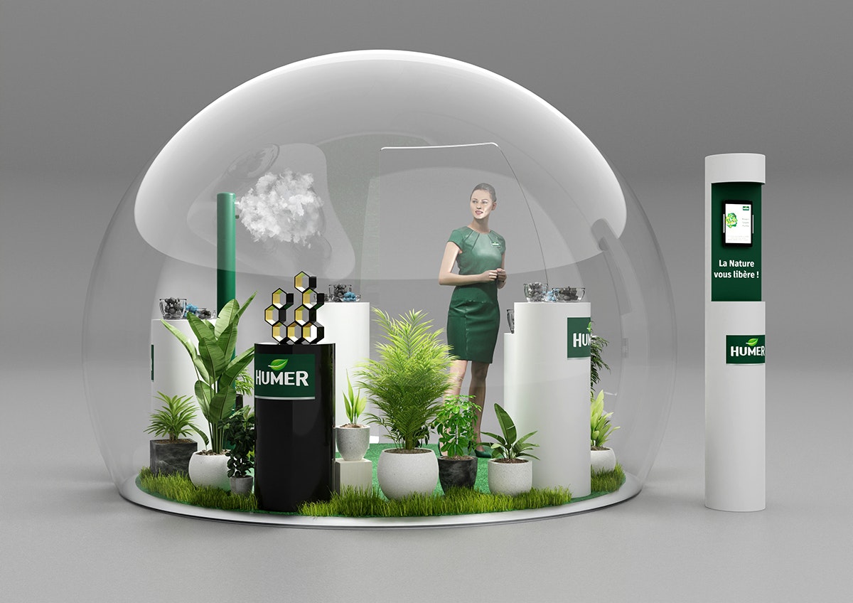 Création du design d'un corner shop pour Humer selon le brief client. Modélisation et mise en volume avec les produits à mettre en avant. Rendus CGI.
