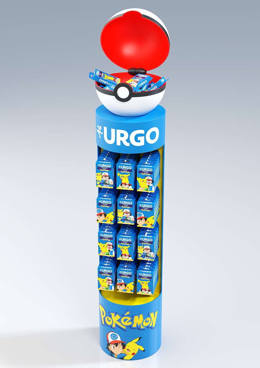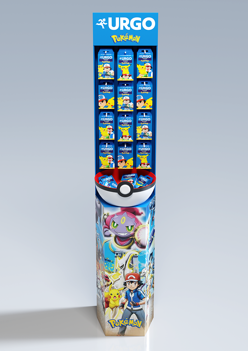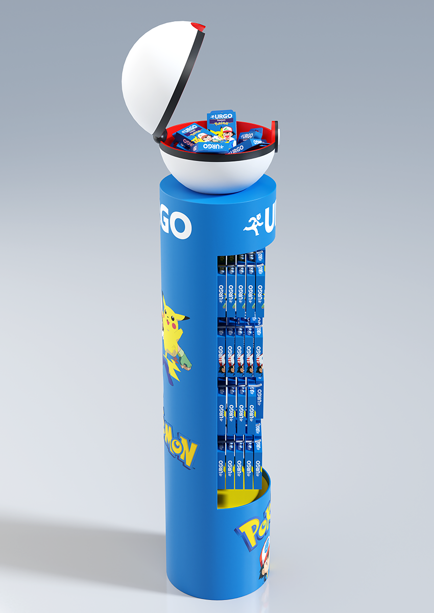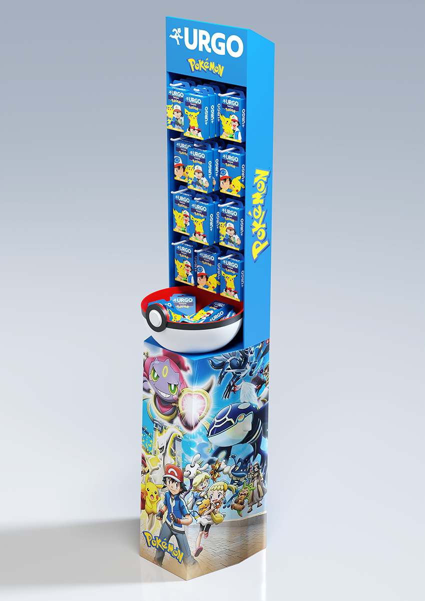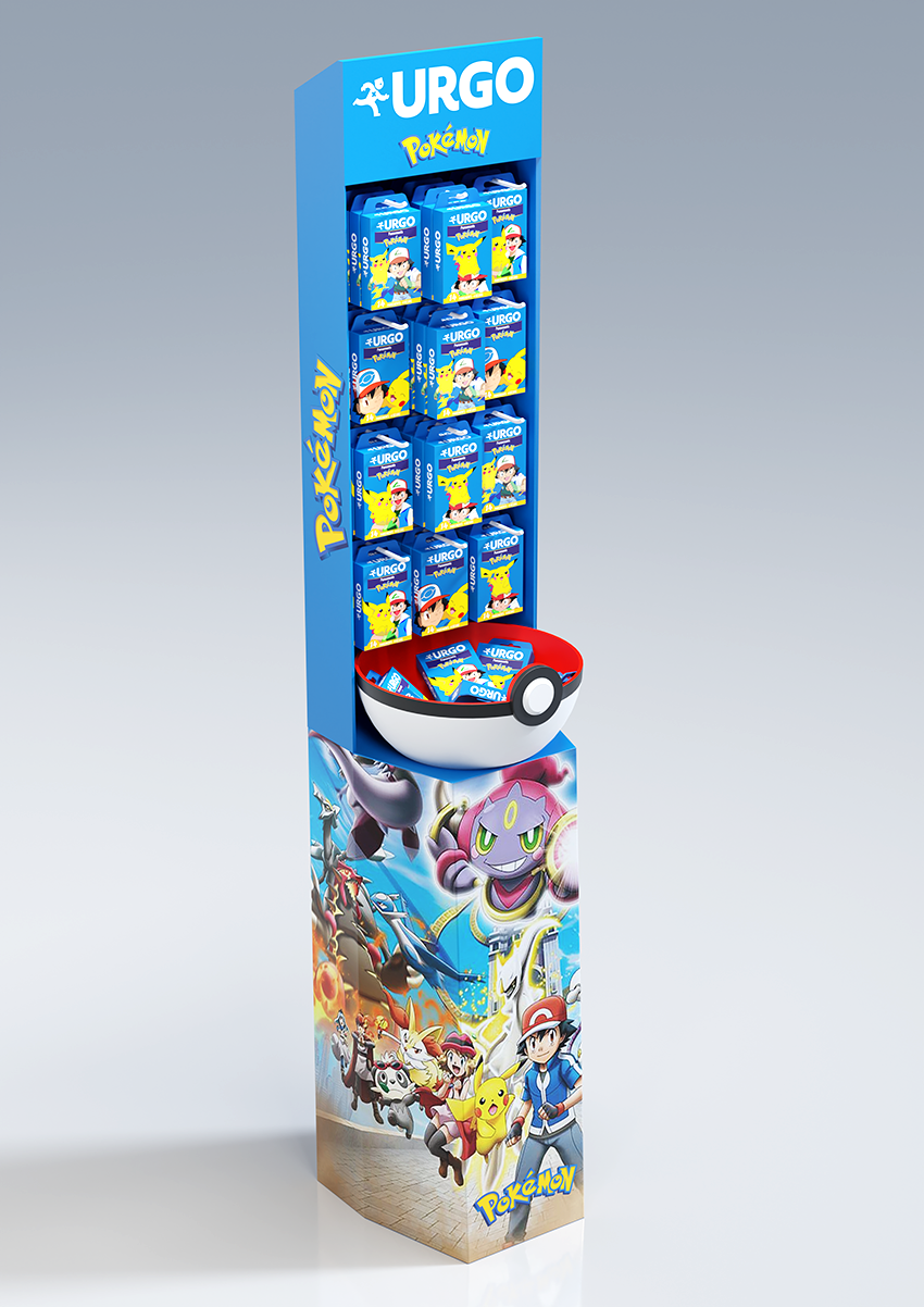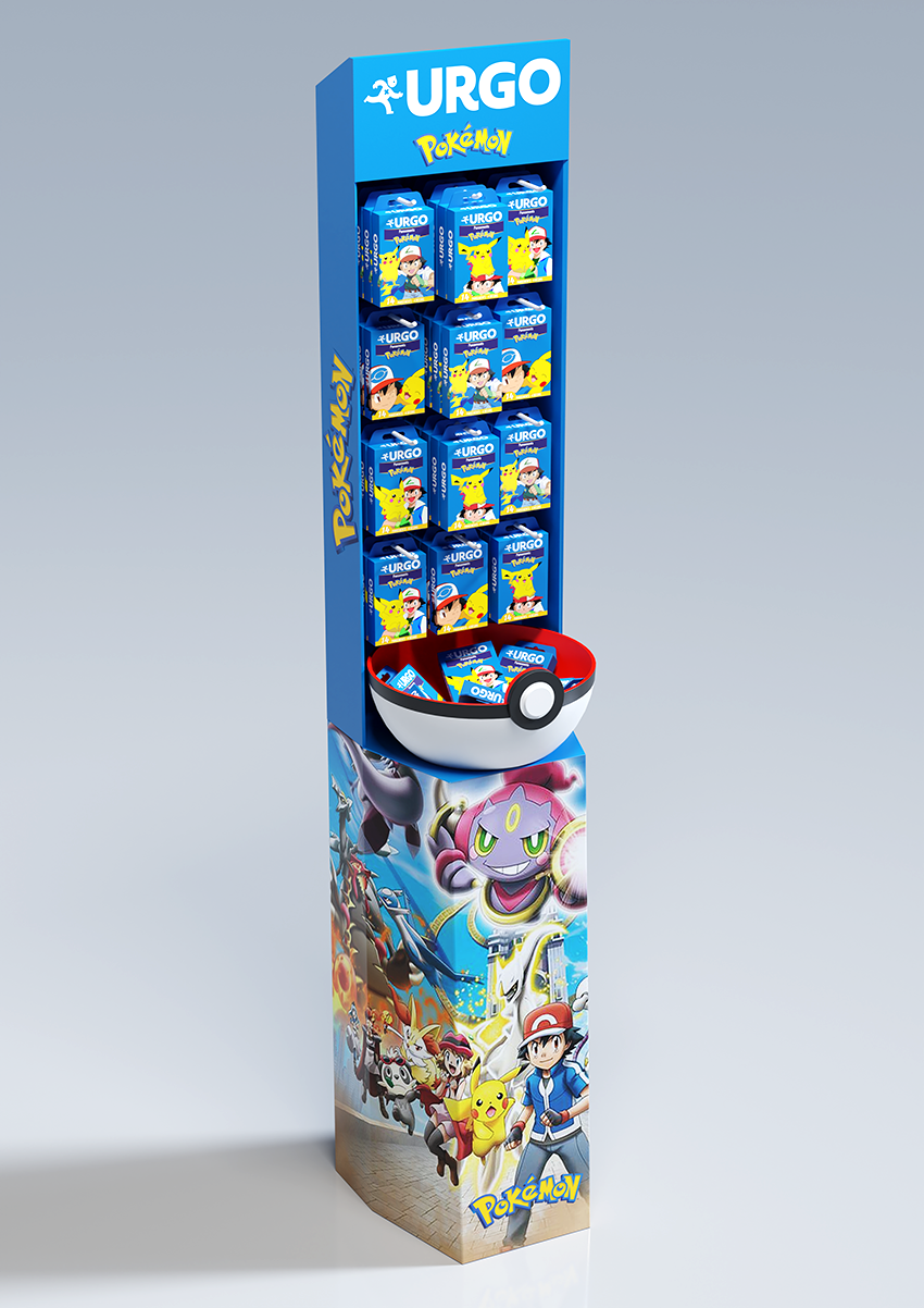 Conception d'une PLV de sol pharmacie sous licence Pokemon. Plan de charge sur 4 niveaux avec une vasque produits en vrac, en 4 axes créas.