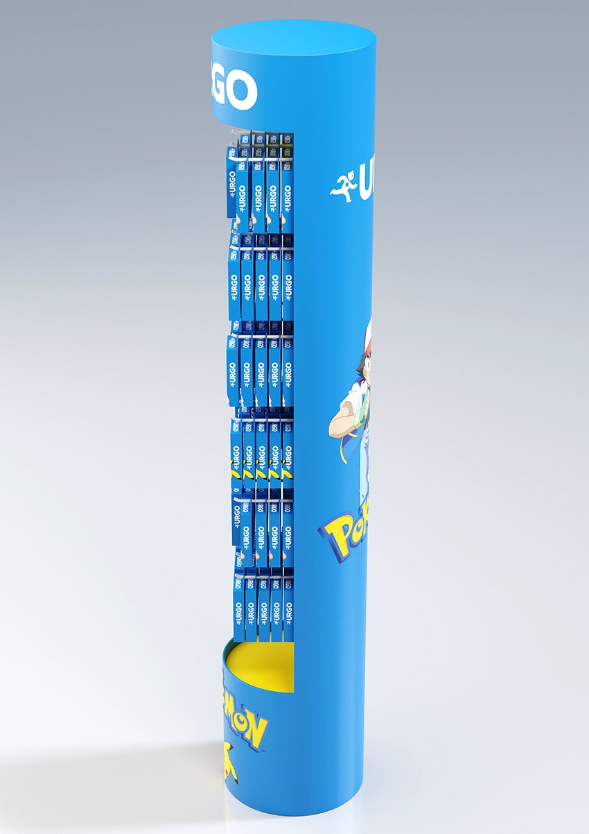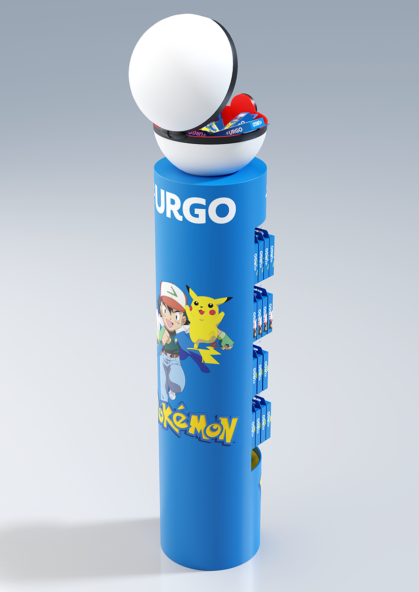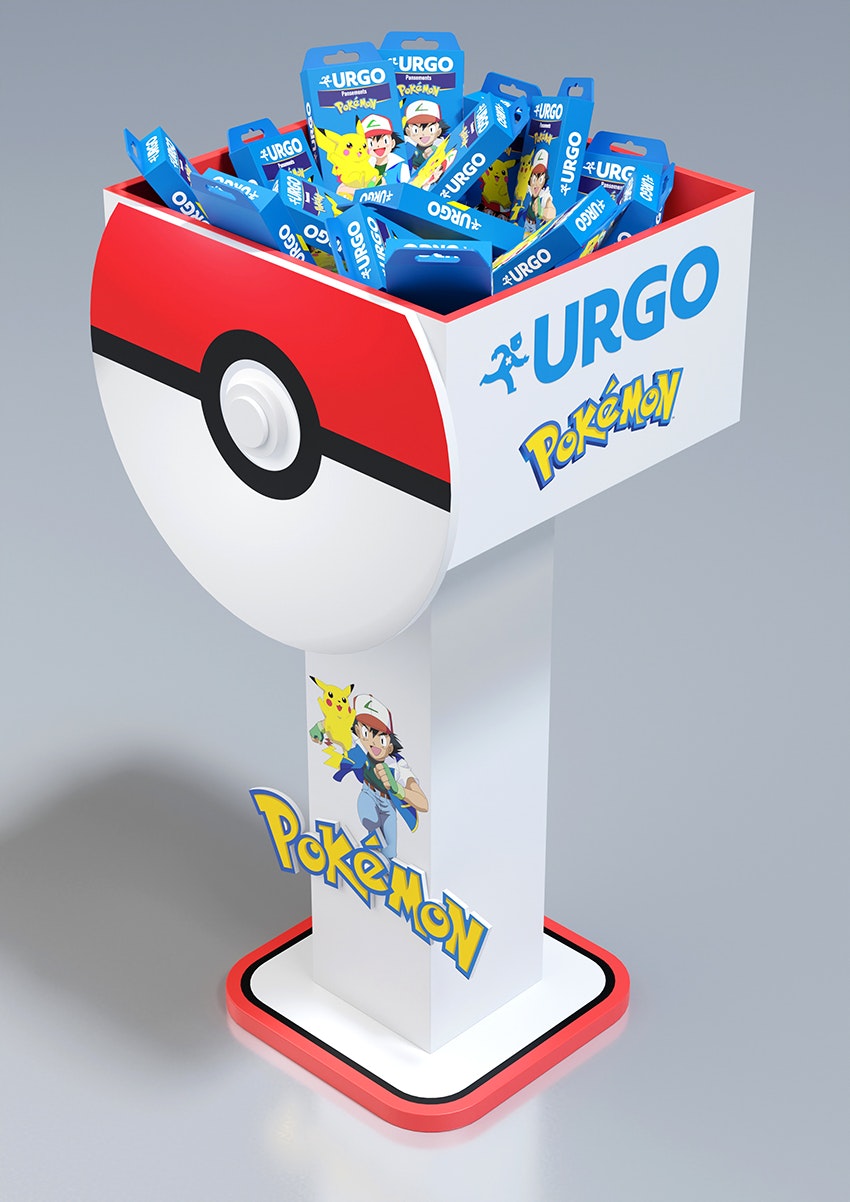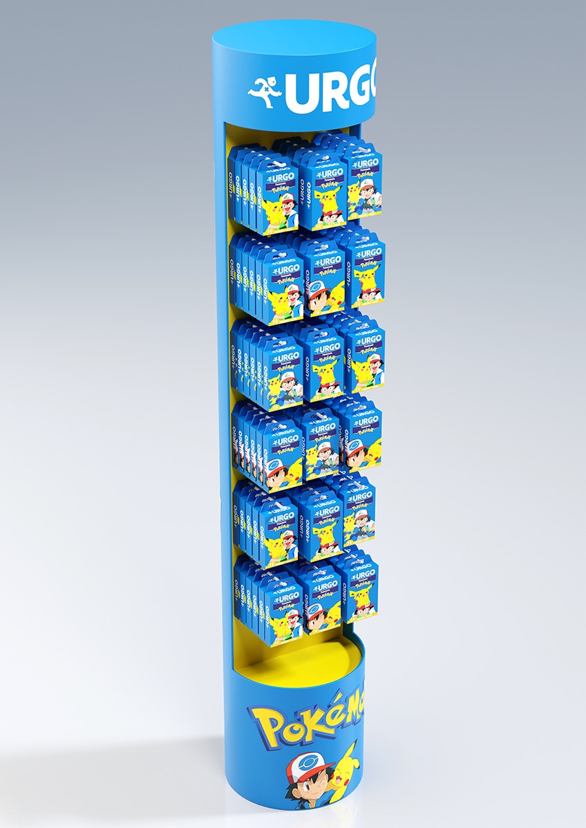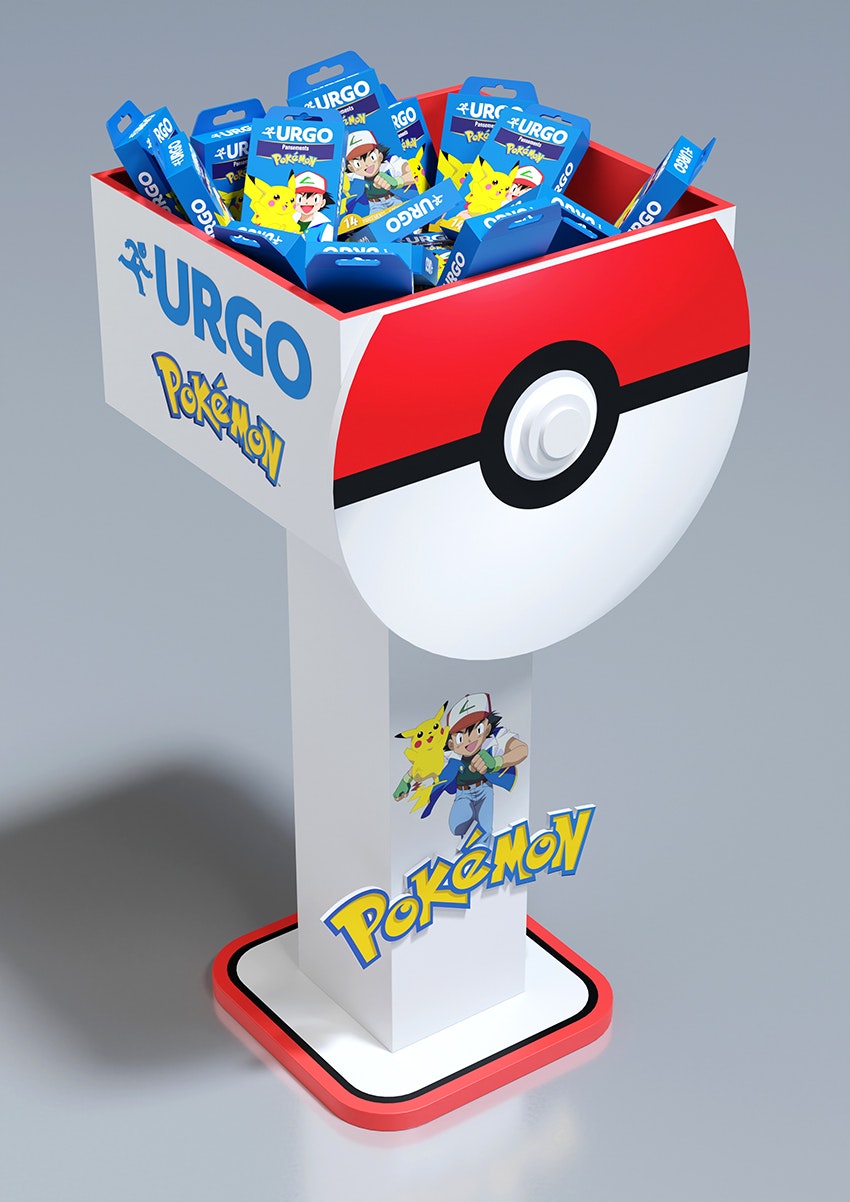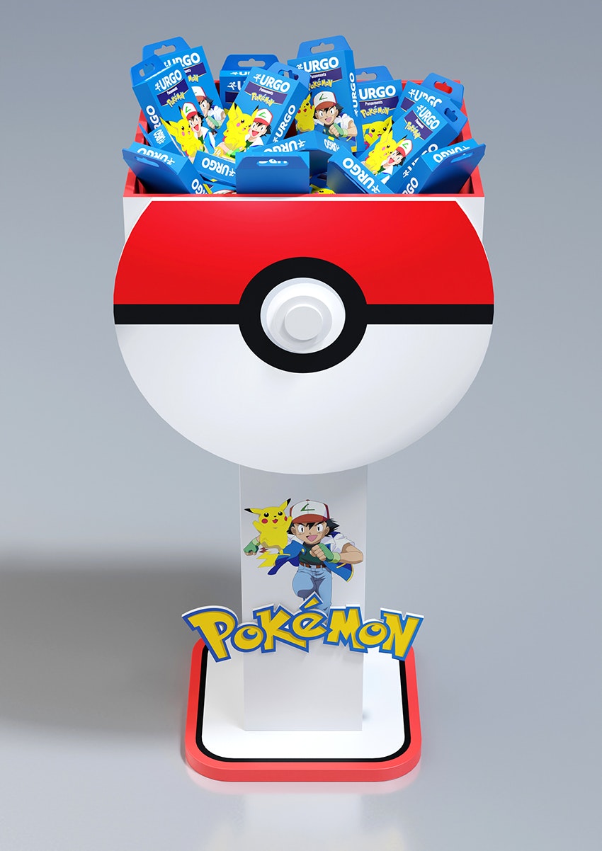 Conception d'une PLV de sol pharmacie sous licence Pokemon. Plan de charge sur 4 niveaux avec une vasque produits en vrac, en 4 axes créas.