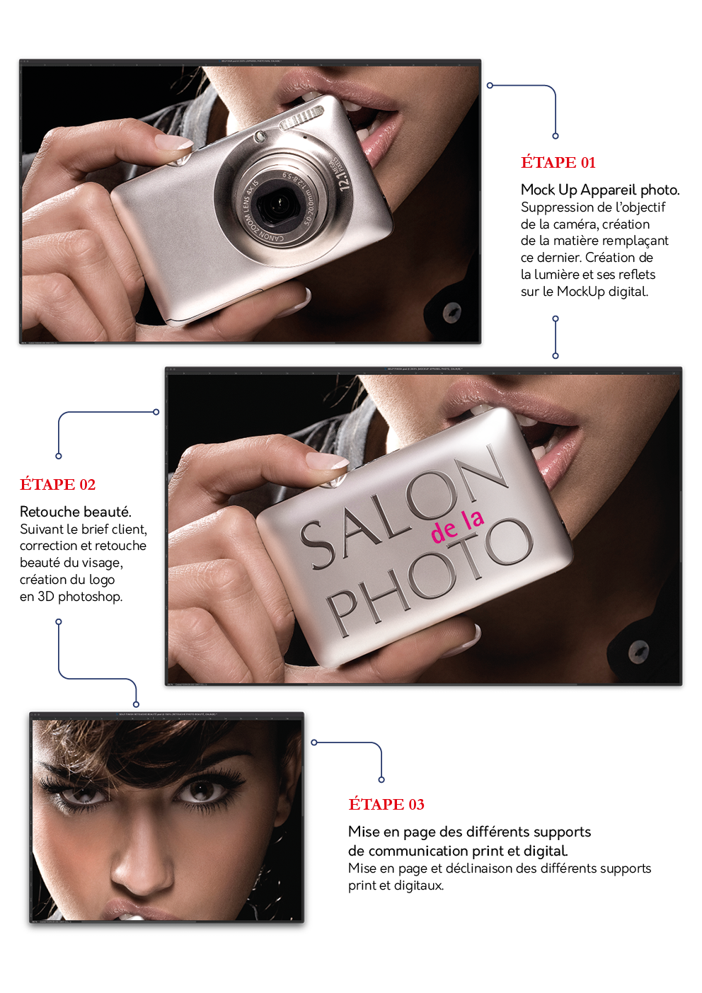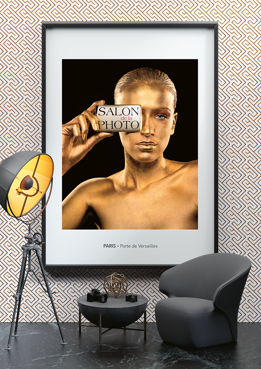 Création par retouche photo de l'appareil photo dans l'esprit "mockup". Suppression de l'appareil photo shooté et création de la matière et intégration du logo Salon De La Photo au visuel.
